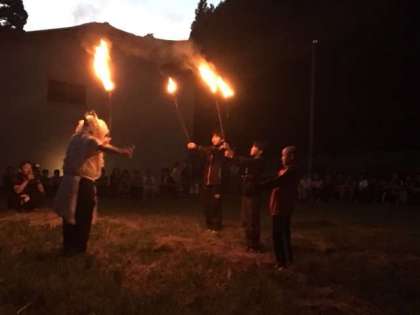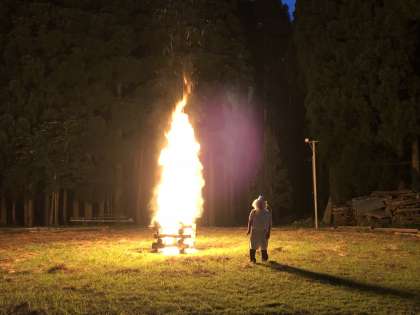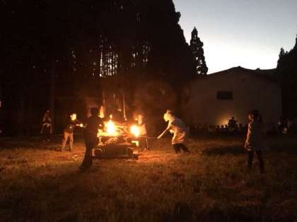 日が沈み、いよいよキャンプファイヤーを始めるための準備です。19時50分頃、火の神から火の子へ火が渡されて4人で点火しました。いよいよスタートです。