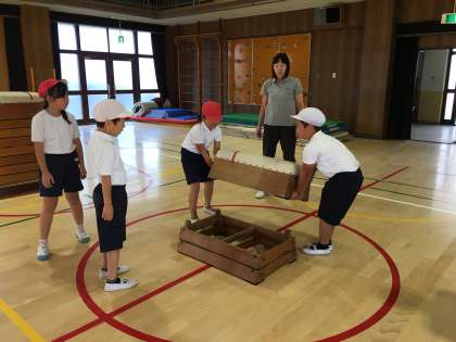 今日は、体育でとびばこやマットの運び方、置き方、片づけ方などを学習しました。友だちと声を掛け合い、慎重に運んでいました。講堂には「いっせーのーで!!」という大きな声が飛び交っていました。