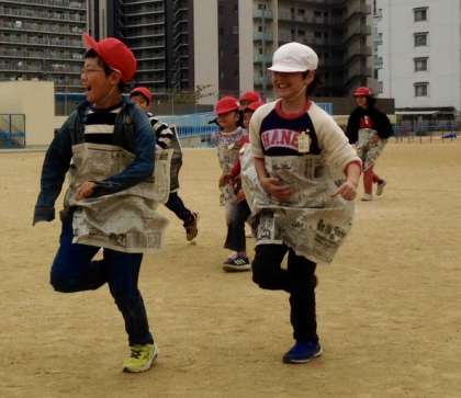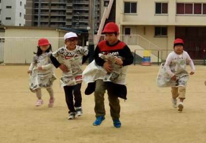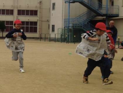 最初の競技は「しんぶんかけっこ」をしました。新聞を落とさないようにゴールを目指しました。みんな落とさずにゴールすることが出来ました!