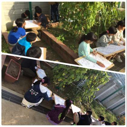 まず、「へちまの葉」を教室で描き、実際に外に出て「へちま」をじっくりと観察しながら集中して描いていきました。