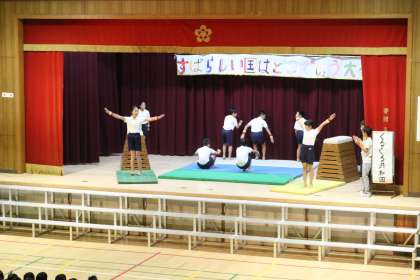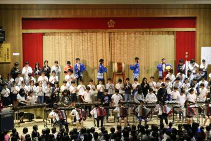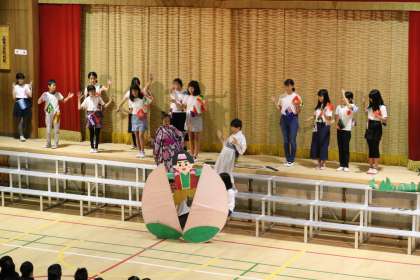 6年生は、劇「『すばらしい国はどこでしょう大会』へようこそ」・合奏「八木節」・合唱「HEIWAの鐘」でした。