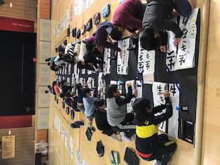 講堂に毛氈(もうせん)という大きな下敷を引いて、書初めをしました。