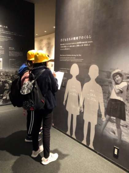 戦時中の子どもたちの暮らしについて書かれた展示では、栄養不足のために6年生女子の平均身長が129.1cm、男子が128.6cm、体重は女子が27.2kg、男子は27.5kgと書かれていました。今とは大違いですね。真剣にワークシートへ写している様子が見られました。