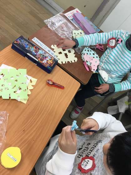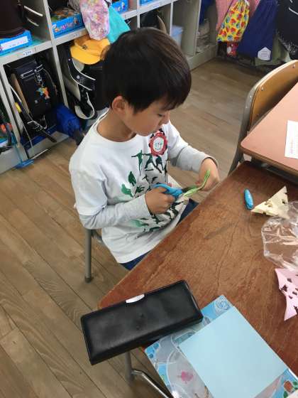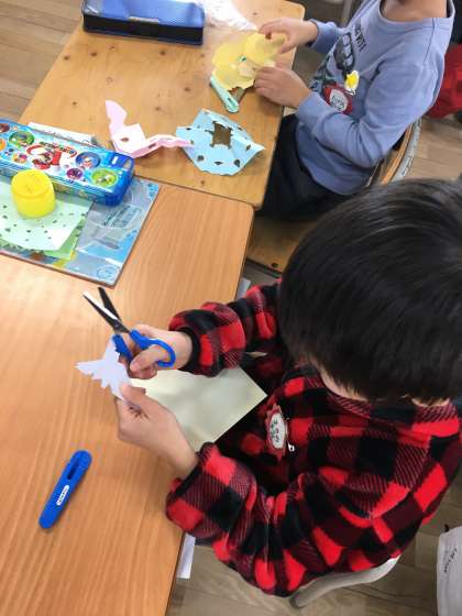 はさみの使い方を復習し、体の前ではさみをつかうことや紙を動かして切ることなどを確認しながら取り組みました。一人一人が雪の結晶作りの名人になりきって、素敵な作品を作り出すことができました。これから色画用紙に貼って、パスで絵を描き加え、雪の世界を表現していきます。