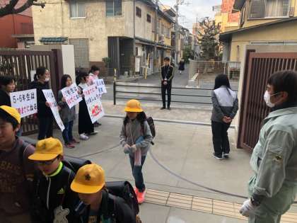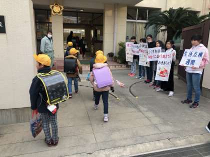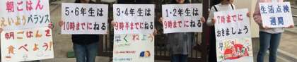 「早寝・早起き・朝ごはん」ができているかどうかを見直す機会にするよう、保健委員会の子どもたちが毎朝校門で呼びかけています。