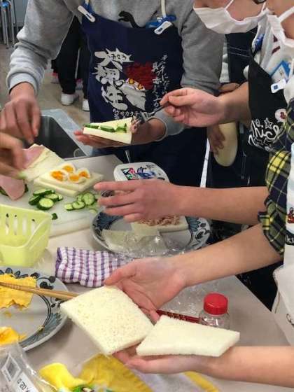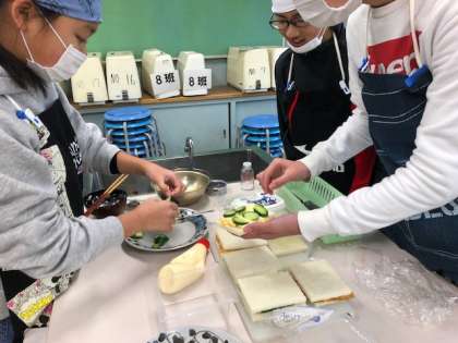 班に割り当てられた材料を工夫してサンドイッチの具にします。