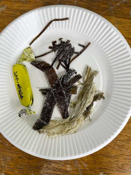 おぐらやさんによる昆布の出前授業をしていただきました。昆布の長さ、昆布がどこで採れるのかなどをみんなで考えた後に、実際に昆布からとれた出汁やお菓子を味わいました!!