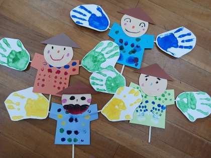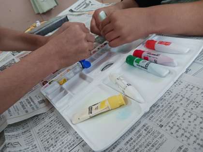 本日のなかよしタイムは製作でした。6年生が校外学習で不在でしたが、5年生がリーダーとなり、絵の具を使って手形とデカルコマニーでかかしを製作しました。同じチームで手助けしたり相談したりしながら、たくさんの工程にみんなで取り組みました。