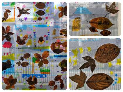 生活科の学習で「秋みつけ」をしました。学校内の木々が色づいて、黄色や茶色、赤色など、素敵な色に変身しています。そんな落ち葉を拾って、国語科の「なにに見えるかな」と関連付けて作品作りをしました。見えるものを決めて葉を並べ、ラミネートをして飾り付けました。