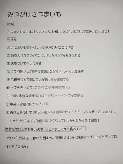 本日のなかよしタイムはさつまいもクッキング「みつがけさつまいもを作ろう」でした。家庭科室で、エプロン、帽子、マスクをつけて、消毒をして調理スタートしました。高学年が手本になったり、助け合ったりしながら、全員が包丁を使ってお芋を切り、フライパンで焼きました。日頃お世話になっている先生方にも食べていただけるように準備して、それぞれがお知らせに行きました。子どもたちから「家でも作りたい!」との声があったので、レシピを作りました。よろしければおうちでも楽しんでください。