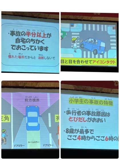 26日の2時間目に交通安全指導が講堂でありました。「どこで事故が起きやすいか」「車の死角はどこか」など、クイズを踏まえて教えていただきました。子どもたちは、一生懸命話を聞き、普段の自分だったらどうしているかと悩む児童の姿も見られました。「止まる・見る・待つ」を合言葉に登下校や放課後の歩き方などに気をつけていけるよう学級でも声をかけていきたいです。お家でも今一度、交通安全についてお話しいただけたらと思います。