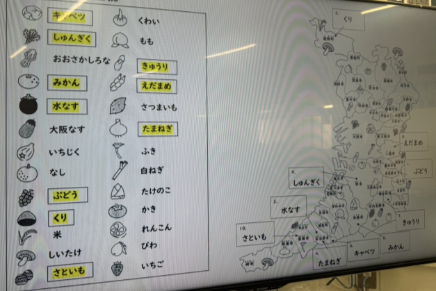 なにわ特産品21種を中心に、大阪府内ではどのような特徴の地域で、どのような野菜がとれるのかを、白地図を使ったクイズを通して学びました。