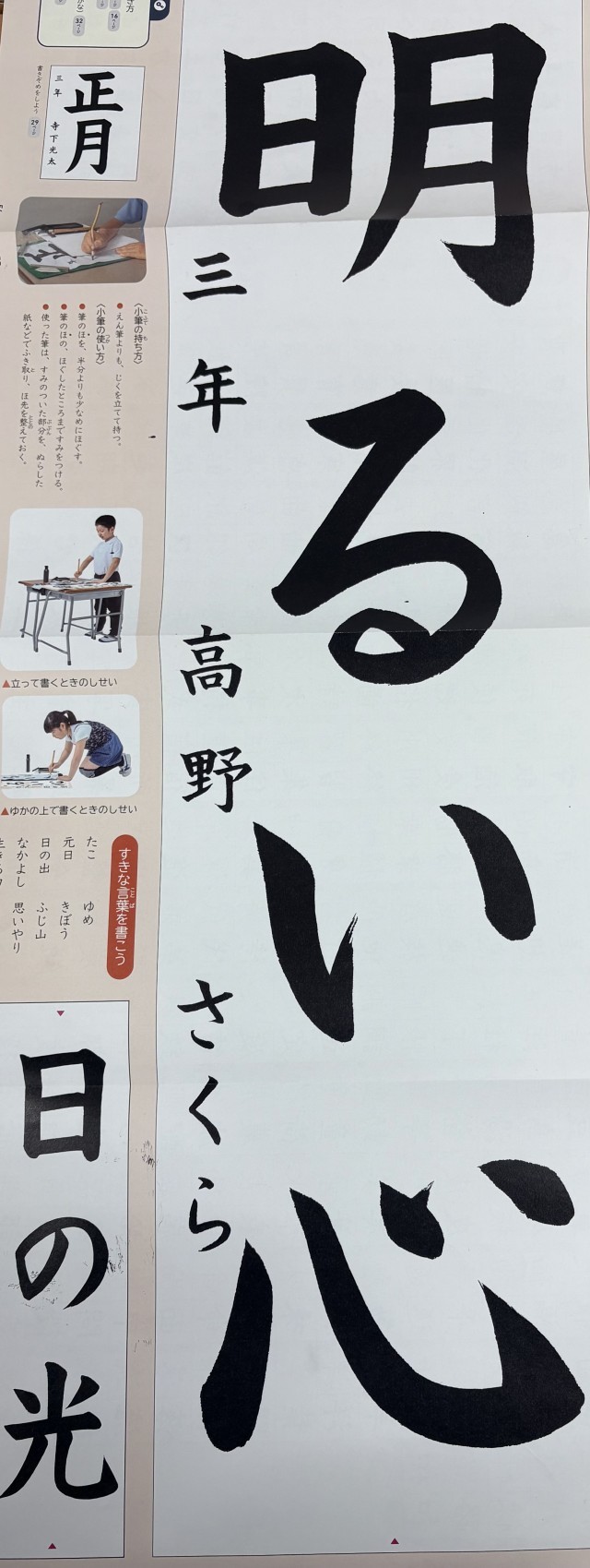 今回は「明るい心」という言葉を書きました。書き初めの学習を通して、筆の持ち方や姿勢、墨の量などを確かめながら、一文字一文字に気持ちを込めて丁寧に書くことを大切にしました。