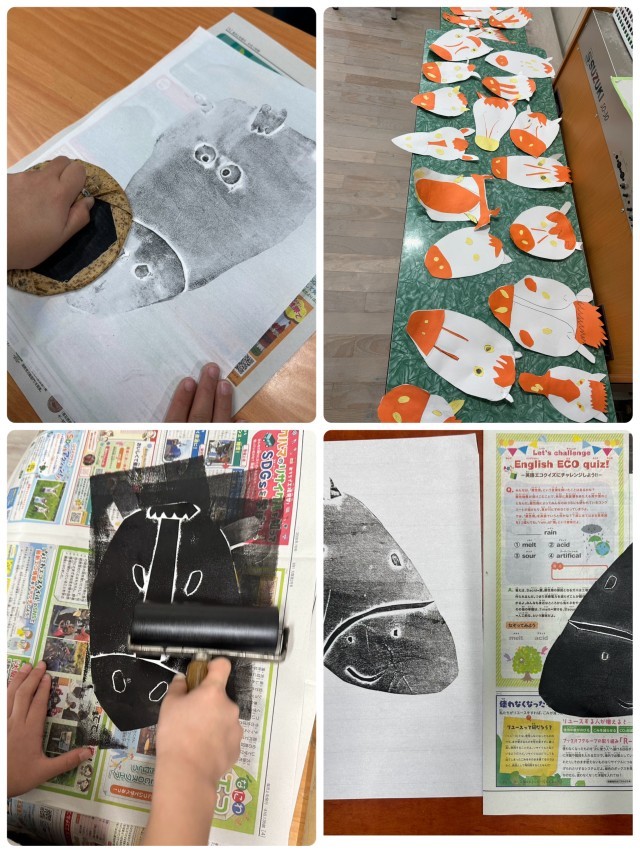2年生では、現在紙版画に取り組んでいます。今年が午年ということで、思い思いの「午」を紙で切り貼りし、そのまわりにニンジンなどを画用紙で作成し、貼り付けました。子どもたちは自分で版を刷るという体験を楽しみながら一生懸命活動していました。参観でも掲示しますので、様々な表情の「午」をご覧いただければと思います。