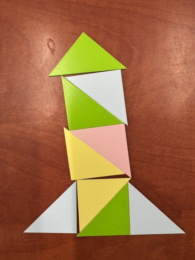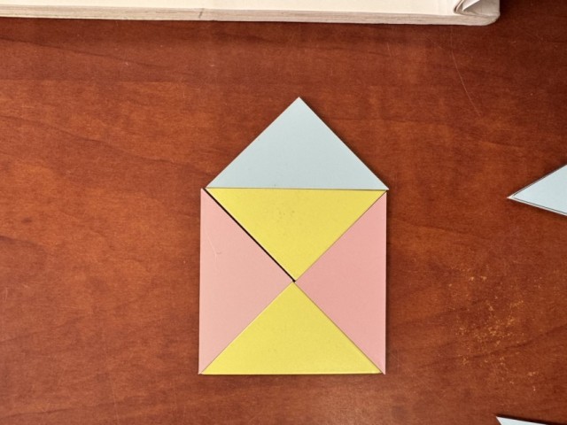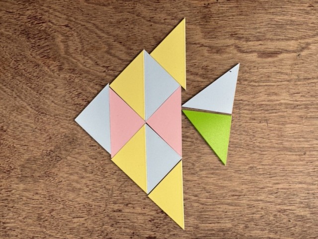 算数科で「かたちづくり」をしています。自分で色板を並べながら、色々な形を作り、楽しく学習に取り組んでいます。