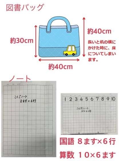 図書の時間に借りた本を入れ、持ち帰りに使います。月曜セット(給食エプロン、体操服、上ぐつ)を入れるバッグとは別のものをご用意ください。図書バッグは机の横にかけるので、写真を目安に、床につかない大きさのものをご用意ください。