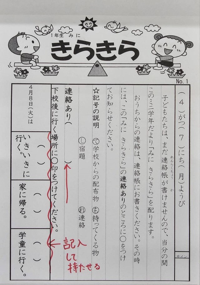 また、みにきらきらも、学校が終わったらどこへ行くのか(帰るのか)を記入して持たせてください。これとは別に、連絡帳も必要です。連絡事項が何もなくても、毎日持たせてください。