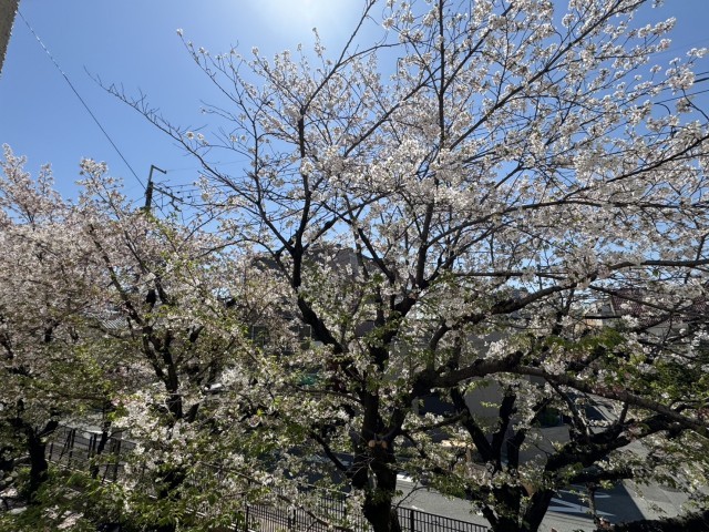 新しい教室からは、きれいな桜が見えます。