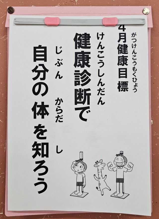 毎月目標が定められている健康目標。4月は「健康診断で自分の体を知ろう」でした。多くの健康診断が行われ、受診が必要なところが見つかることもあると思います。