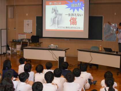 KDDIの講師さんがスマホの使い方を間違うと、どんな恐ろしいことが起こるのか、事例ごとに分かりやすく解説してくださいました。実際にあったトラブルをもとに構成された動画を子供たちは熱心に見て学習しました。本日、資料を子供たちが持ち帰ります。ご家庭でも一度スマホ、携帯の使い方についてお話ししていただけると幸いです。