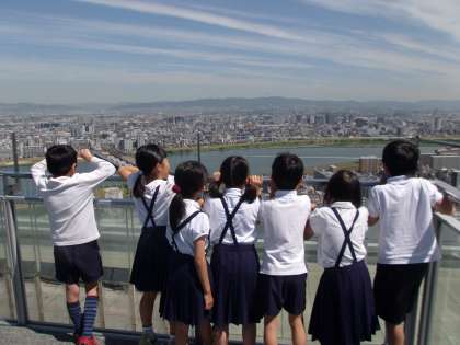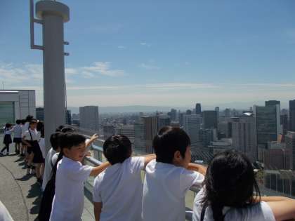 5月22日(水)3年生がスカイビルへ社会見学に行きました。地上140mから大阪市の様子を観察しました。天気がよく、遠くの方までよく見えました。空中庭園では、班行動をし、大阪城やエキスポシティを見つけて大喜びでした!!