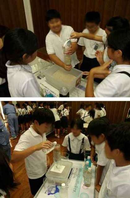 「砂」や「活性炭」に色水を入れると、出てきた水は透明で、においもなく、びっくりしました。