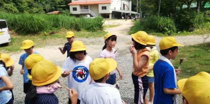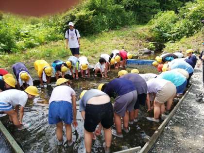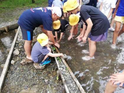 最初に説明を聞き、水の中に入って指先を水につけて水なれ。そして合図とともに魚つかみがスタート。苦労してとった魚を串焼きにしておいしくいただきました。