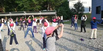 2日目の朝です。1日目は暑かったですが、朝はさわやかです。写真はラジオ体操です。