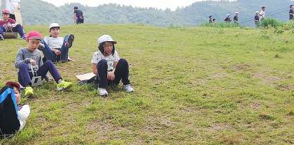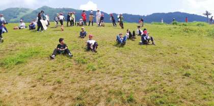 モニュメント近くの広場で、手製のそりで芝すべりをしました。はじめはなかなかすべりませんでしたが、何回かすべっている間に、うまくすべることができるようになってきました。