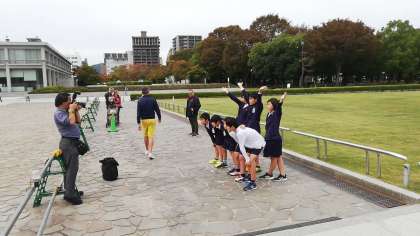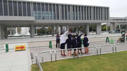 平和記念資料館前で班ごとに写真を撮っていただきました。