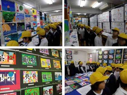 短時間ではありましたが、先輩達の素晴らしいデザイン画、砂絵、都道府県新聞、エコ作品などの展示物を鑑賞しました。