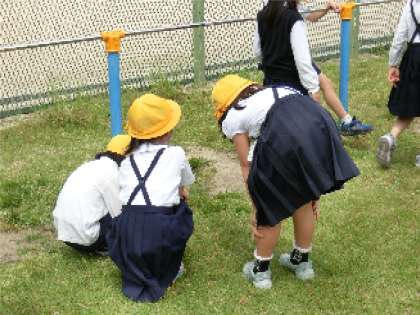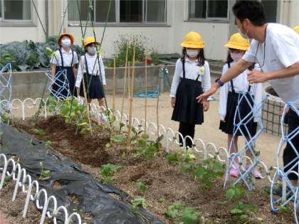 今日は、健康観察や手紙の確認の他に、学習園の「大豆」「キュウリ」「ナス」「サツマイモ」の観察に行きました。また、生活科の「春をさがしに」の教科書を見た後に、中庭で春さがしをしました。