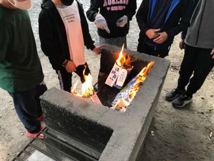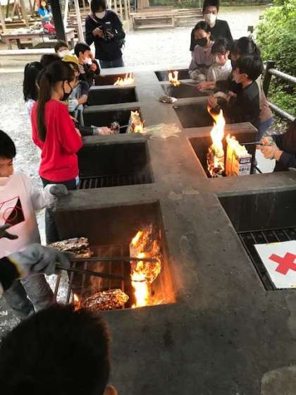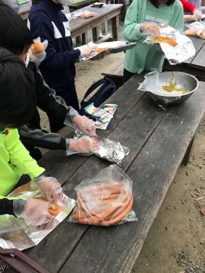 パンにソ−セージなどの具をはさみ、アルミホイルに包んで牛乳パックに入れて焼きます。上手に焼けるかな。