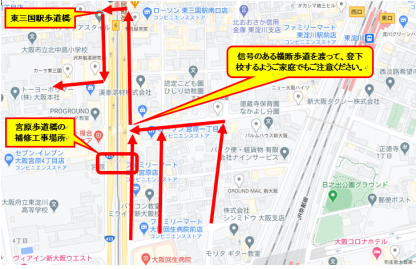〇工事期間中であっても、宮原歩道橋を通って登下校することができますが、全日通行止めの期間中は、地図の示す通り地下鉄東三国駅の歩道橋を通っての登下校となります。