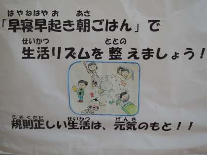 今週は、「手洗い・うがい・睡眠強調週間」でした。前回の反省からがんばりたい目標を達成するため、規則正しい生活を見直すことはできたでしょうか。合言葉は「早寝早起き朝ごはん」です。強調週間が終わっても、元気で過ごせるように規則正しい生活を意識していきましょう。