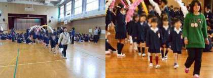 新1年生は、入学してからほとんど教室の中で学習していました。児童朝会にも出ないで、教室で過ごしていましたが、この迎える会からは、他の学年の児童と朝会で、初めて顔を合わせ、次の児童朝会からは新1年生として参加します。