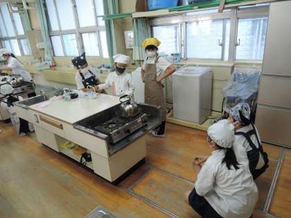 まずは、食器や用具の位置を確認したり、ガスコンロの使い方を知ったりと、一つ一つ丁寧に学習しました。初めての火の扱いは緊張したようで、やけどをしないように班の友だちと協力しながら、活動していました。