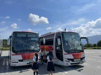バスの中では、キャンプファイヤーの歌を聴いたり、DVDを見たりしています。