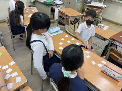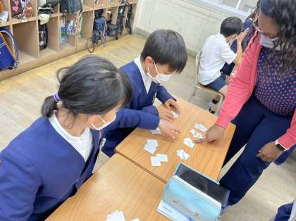 絵カードを使って学習用具の単語について学習しました。ニコル先生の英語での説明を理解しようと一生懸命話を聞きました。ゲームは、楽しみながら取り組むことができました。