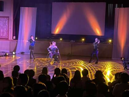 文化庁-文化芸術による子供育成推進事業により車いすダンスのジェネシス オブ エンターテイメントのみなさんにダンスの披露とお話をしていただきました。各学級から代表で車いすダンスにも挑戦しました。自分と違う立場で生きる人の生き方や想いを感じ、自分たちの周りにある人間関係や生き方についてしっかりと考える時間となりました。