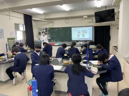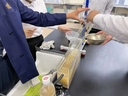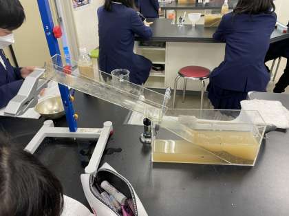 地層のでき方について実験道具やペットボトルを使って調べました。できた地層を見て、水底に粒の大きさによってたい積していく様子を学習しました。