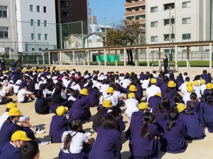 理科室からの出火を想定し、使用する階段を場所に応じて変更して避難しました。全校児童、素早く運動場へ退避することができました。