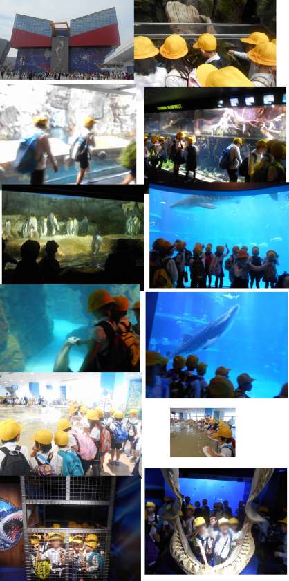 10月9日(金)2年生が海遊館へ遠足に行きました。海遊館では、ジンベイザメを見て大きさに驚き、バンドウイルカを見てスイスイ泳いでいる姿に歓声が上がり、ペンギンのかわいいしぐさに見とれていました。また、クラゲがたくさんいて幻想的な世界に子どもたちから「キレイ!!」と声が上がりました。エイやサメが触れる体験コーナーもあり「サメはザラザラしていたよ。」「エイはヌルヌルしてた。」とうれしそうにしていました。最後にシャークワールドでサメの世界を楽しみました。お弁当の後、天保山に行き公園で遊んでから帰りました。お天気にも恵まれ、楽しい遠足でした。
