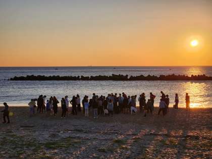 浜辺での朝の会。みんなでラジオ体操をしました。その後、今日の活動の確認をしました。