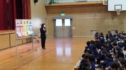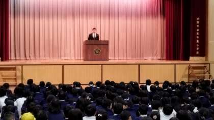 12月22日(金)、講堂にて終業式を行いました。校長先生と生活指導の先生から「2学期のふりかえり」や「冬休みの過ごし方」などについてのお話がありました。