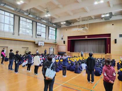 2月1日(木)、地震を想定した避難訓練を実施しました。2時間目が終わった後の休憩時間での実施でしたが、子どもたちは慌てることなく体育館に避難できました。集合してからは、校長先生や担当の先生の話を静かに聞きました。
