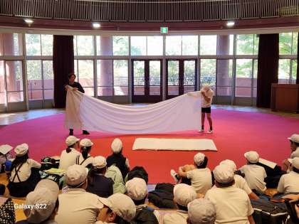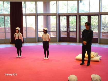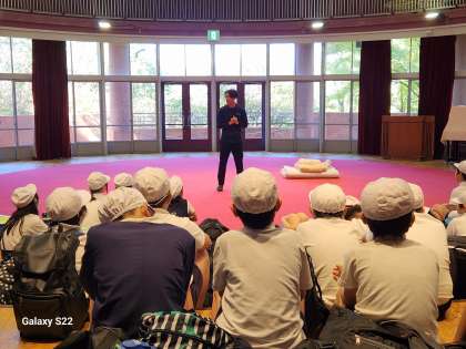 入所式を行い、オリエンテーションで自然の家のきまりや部屋の様子、布団のあげおろしについての説明を受けました。
