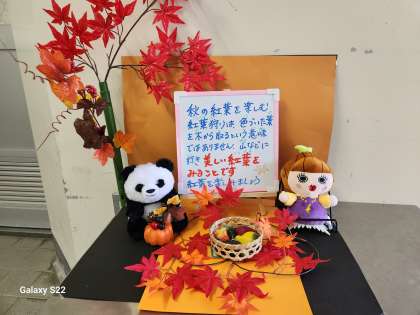 すっかり秋も深まり、朝夕の冷え込みが増してきました。みなさまもどうぞ体調に気を付けて、健やかな日々をお過ごしください。学校の給食室前には、秋を感じさせる素敵な掲示物が飾られています。