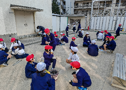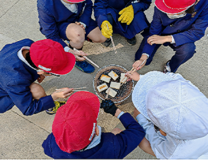 社会科の学習で、七輪を使って火をおこしお餅を焼く体験を行いました。マッチを使って新聞紙に火を着け、うちわを使って炭に火を移すという体験をする中で、昔の人の暮らしの大変さを感じることができました。