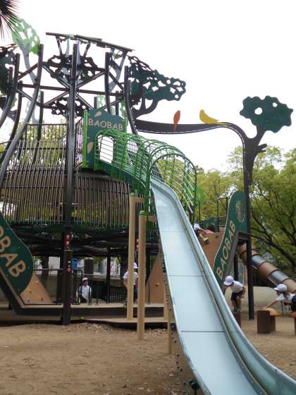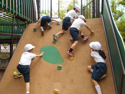江坂公園に着くと、大きな遊具で体いっぱい動かして遊んでいました。友だちと滑り台をすべったり、ボルダリングで声を掛け合って登ったりと、学校ではできない遊びをたくさん楽しみながら、また新たに友だちとの仲を深めている姿が微笑ましかったです。